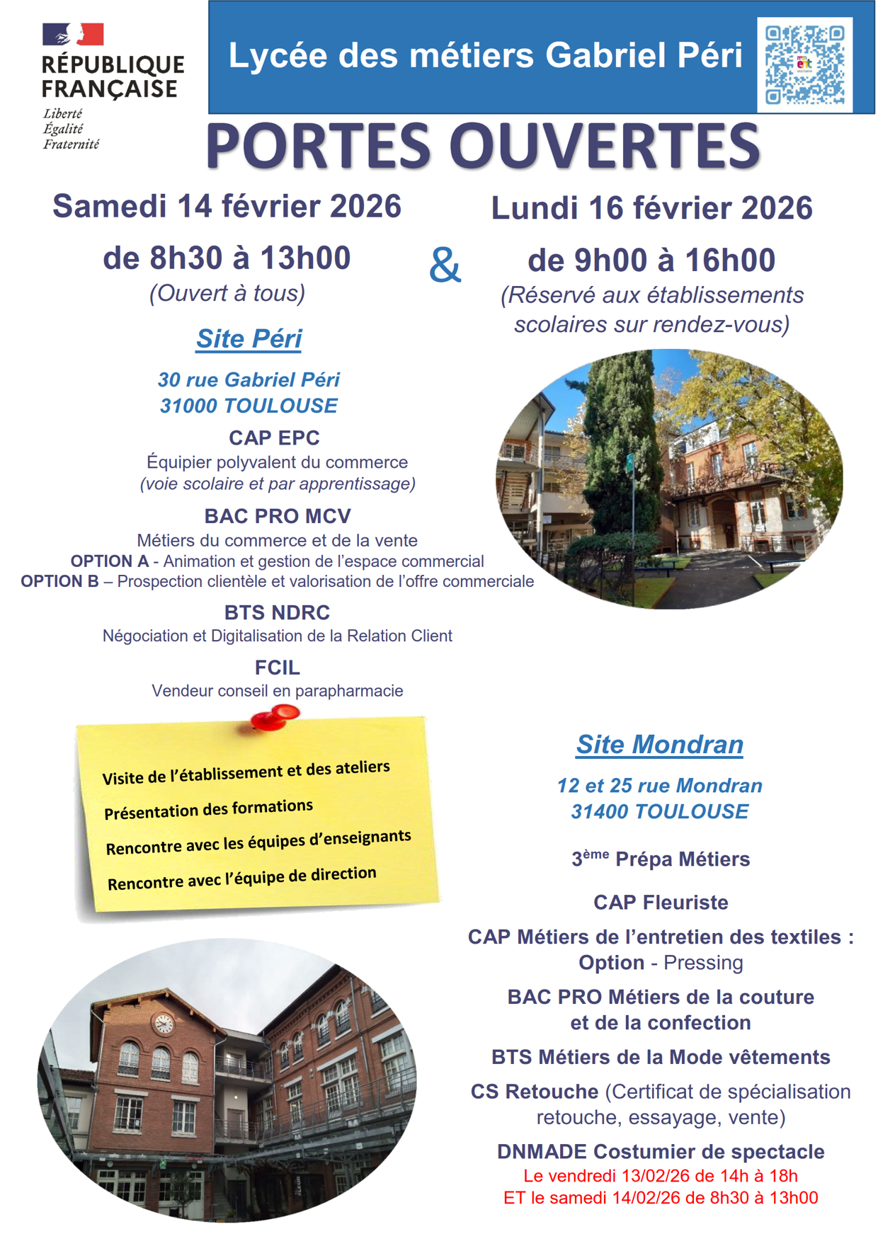 Portes ouvertes : samedi 14 février 2026 de 8h30 à 13h00
